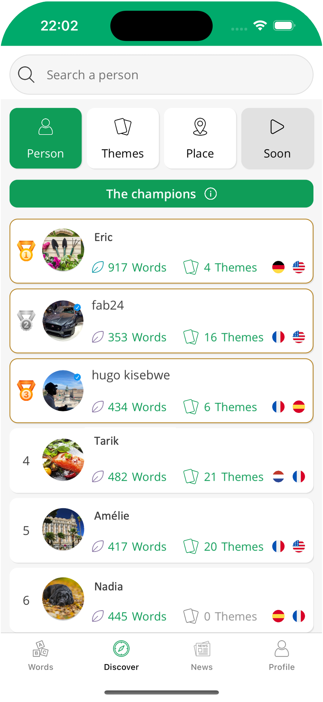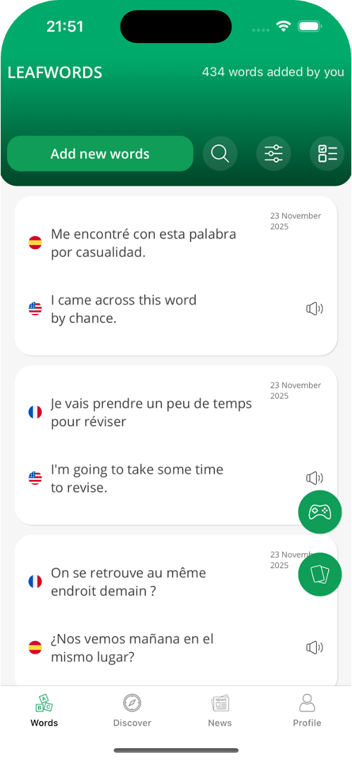 Le contenu de Leafwords s'adapte à ton pays ou ta prochaine destination. Découvre les news locales en temps réel tout en enrichissant ton vocabulaire en contexte.